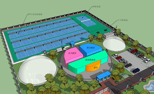 鄭州氣膜網(wǎng)羽中心有一個包括27片羽毛球場地及兩片網(wǎng)球場地與若干兵乓球場地占地有4500平米的氣膜運動館,此外還另有三處附屬氣膜建筑,分別作為洗浴中心及會所,占地約1000平米;另兩座分別作為咖啡廳與茶餐廳。